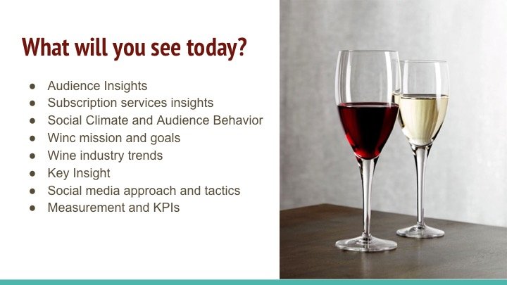 For my Social Media Strategy class in my Emerging Media Studies Masters program, I devised a social media strategy for a wine subscription company - Winc.